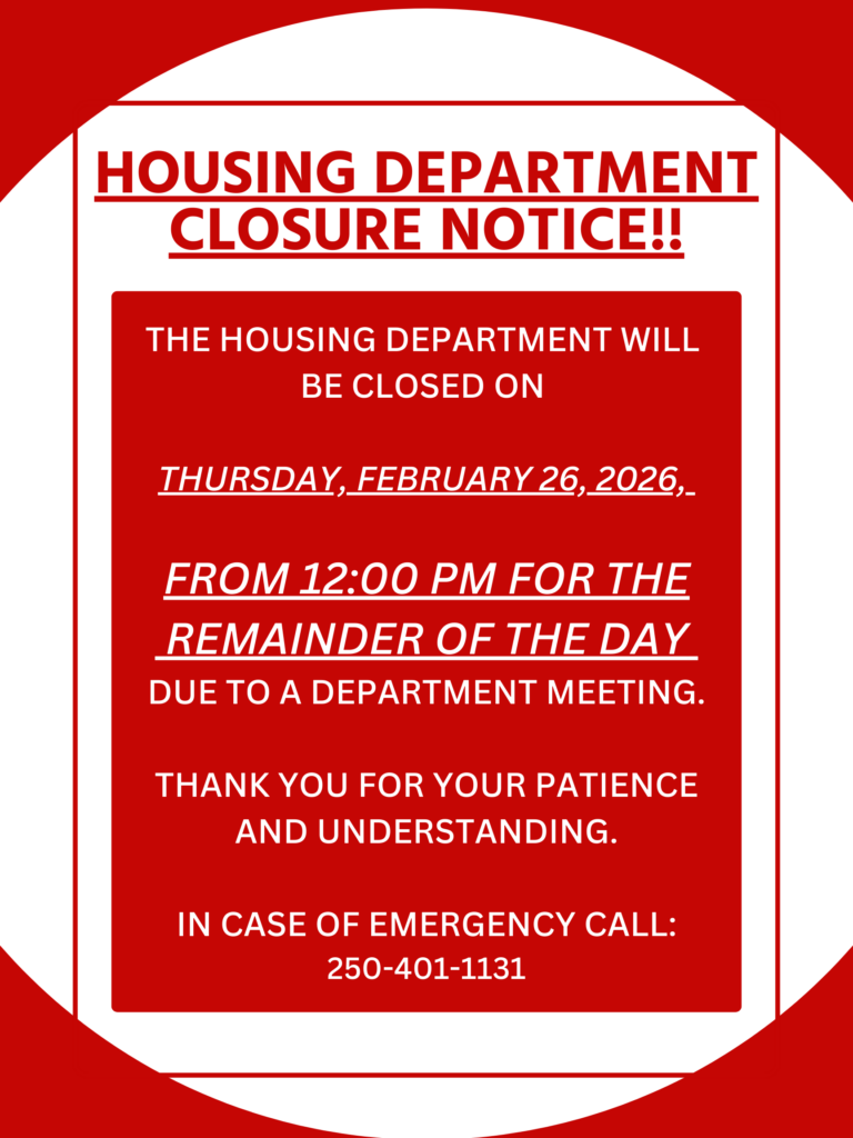 Please note that the housing department will be closed Thursday February 26, 2026 from 12:00pm to end of day due to a department meeting.