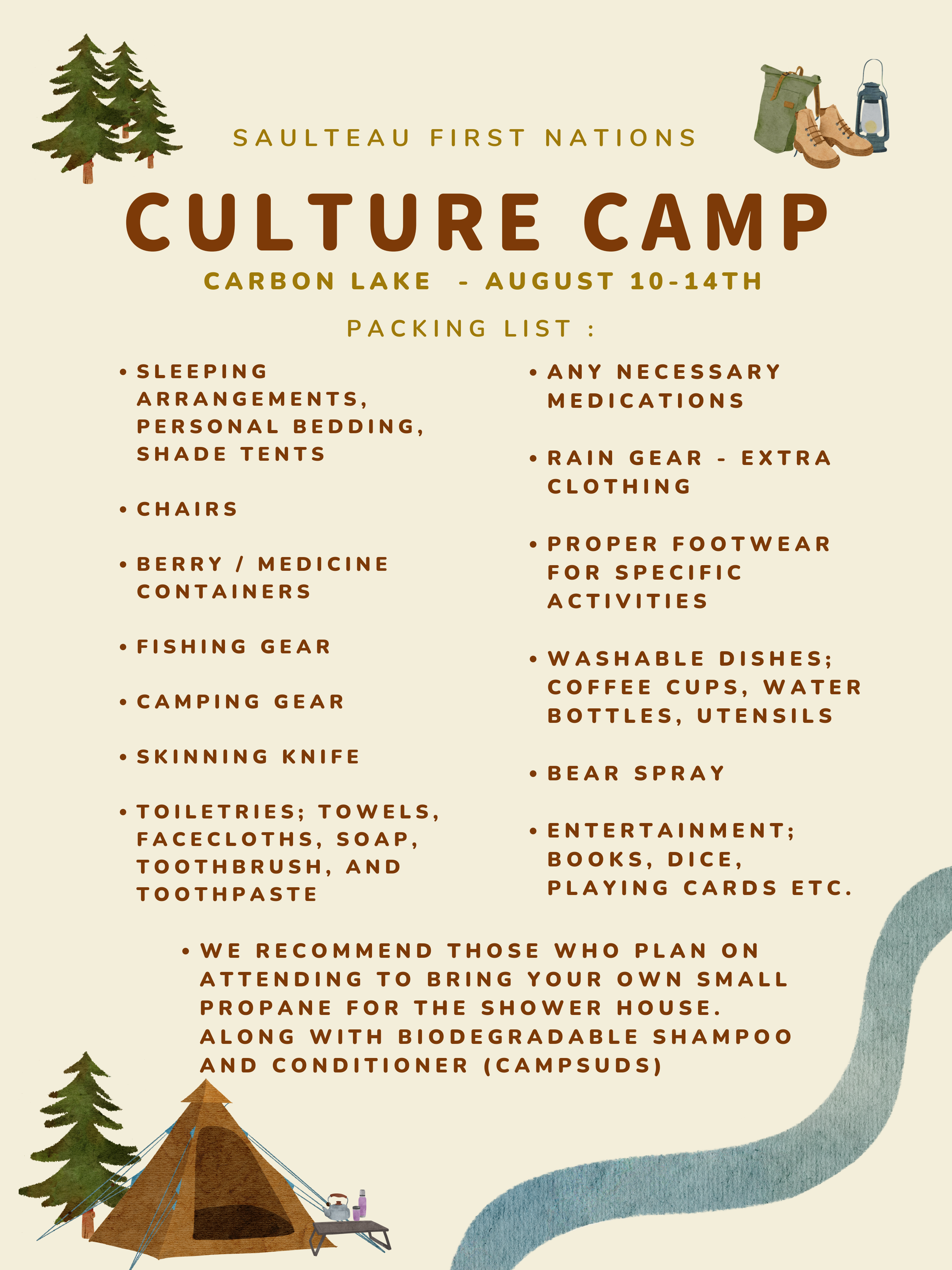 Come spend time on the land with us for a week of learning, healing, and cultural connection. Whether you are staying the week or visiting for the day, this is a time for community, sharing, and growth across generations.