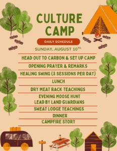 Come spend time on the land with us for a week of learning, healing, and cultural connection. Whether you are staying the week or visiting for the day, this is a time for community, sharing, and growth across generations.