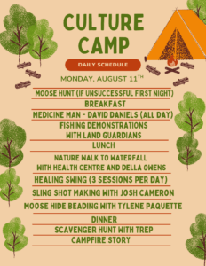 Come spend time on the land with us for a week of learning, healing, and cultural connection. Whether you are staying the week or visiting for the day, this is a time for community, sharing, and growth across generations.