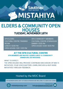 SFN Community Members are invited to attend the upcoming Mistahiya Development Corporation (MDC) Elders & Community Open Houses, hosted by the MDC Board of Directors.