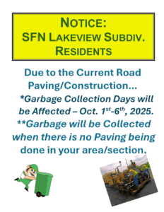 Due to ongoing road paving and construction in the SFN Lakeview Subdivisions, garbage collection will be affected: