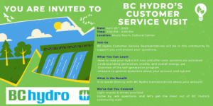 Join us for a visit from BC Hydro Customer Service Representatives on April 23rd from 3:00–6:00 PM at the Cultural Center (Music Room).
