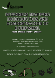 Join us at the New Beginnings House on February 1, 2026 from 1:00 pm - 6:00 pm. Contact Chelsea to register at cgauthier@saulteau.com