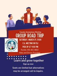 Join us for a supportive group road trip to a C.A. meeting in Fort St. John. Transportation and dinner are provided, just bring yourself and an open mind.
