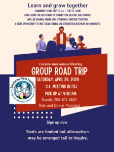 We’re heading to Fort St. John for a Cocaine Anonymous meeting, sharing a meal, and building community together. This is a great opportunity to connect with others, strengthen recovery, and spend time in a supportive environment.