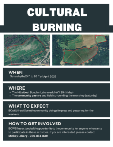 BC Wildfire Service will be in the community completing site preparation and supporting a cultural burn over the weekend. This is an opportunity to learn about traditional land stewardship practices and how they contribute to wildfire risk reduction and ecosystem health.