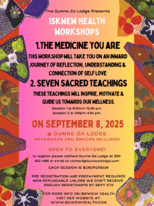The SFN Wellness Department is sponsoring 5 seats in the Iskwew Health Workshops happening at Dunne-Za Lodge!