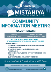 You are invited to attend the upcoming Mistahiya Development Corporation (MDC) Community Information Meeting, hosted by Chief & Council with the MDC Board.