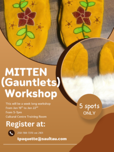 Our Cultural Coordinator is running a week long mitten making workshop - from January 19th - 27th 2026, from 5:00 - 7:00 PM in the evenings at the SFN Cultural Centre!