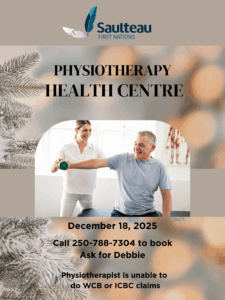 Physiotherapy will be at the SFN Health Centre on Dec 18 2025 - call 250-788-7304 to book, ask for Debbie!