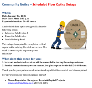 On January 16/2026, starting at approximately 1:00 PM some areas of our community will experience an internet outage lasting 24-48 Hours.