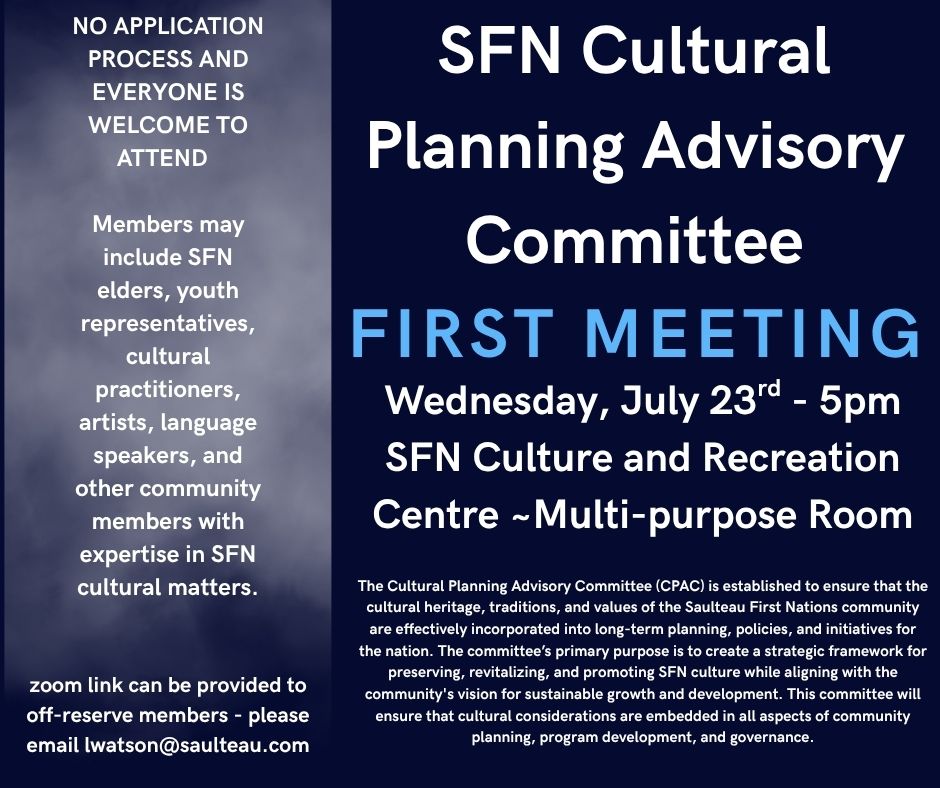 The purpose of this new advisory committee is to guide long-term planning for SFN culture — including revitalization, preservation, and sustainable growth that honours our heritage and values.