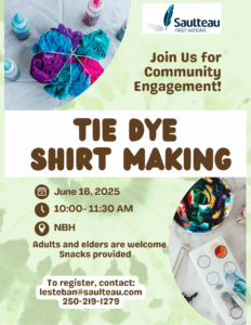 Join us for Community Engagement! Tie Dye Shirt Making June 16, 2025 10:00- 11:30 AM Location: NBH Adults and elders are welcome Snacks provided To register, contact: lesteban@saulteau.com 250-219-1279