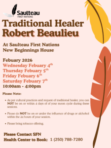 Traditional Healer available at New Beginnings House throughout various dates in February from 10:00 am - 4:00 pm. Please contact SFN Health Center to book! (250) 788 - 7280