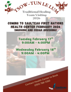 Tsow - Tun le lum Traditional Healing Team will be visiting the Health Center on February 17 & 18th from 9:00 am - 4:00 pm. Contact the Health Center to book at (250) 788 - 7280
