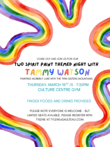 Two Spirit Paint Night with Tammy Watson on Thursday March 19th from 5 - 7:30 pm in the Cultural Centre Gym!