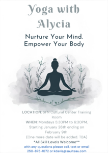 Join us on Monday evenings from 5:30 - 6:30 PM for Yoga in the SFN Cultural Centre Training Room! All Skill Levels Welcome!