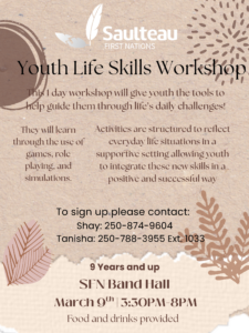 Youth Life Skills Workshop | March 9th 3:30pm - 8pm at SFN Band Hall. To sign up call Shay at 250-874-9604 or Tanisha at 250-788-3955 ext 1033.