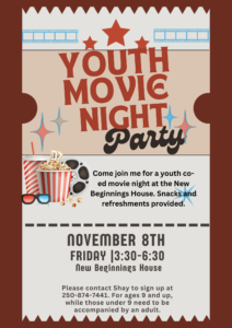 Please join us for a Youth Movie Night Party! Happening November 08/2024 (Friday) from 3:30 - 6:30 PM at the New Beginnings House!