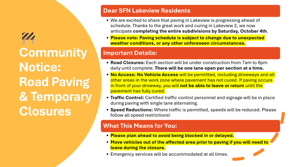 We are excited to share that paving in Lakeview is progressing ahead of schedule. With the excellent work in Lakeview 2 this morning, we now anticipate completing the entire subdivision by Saturday, October 4th