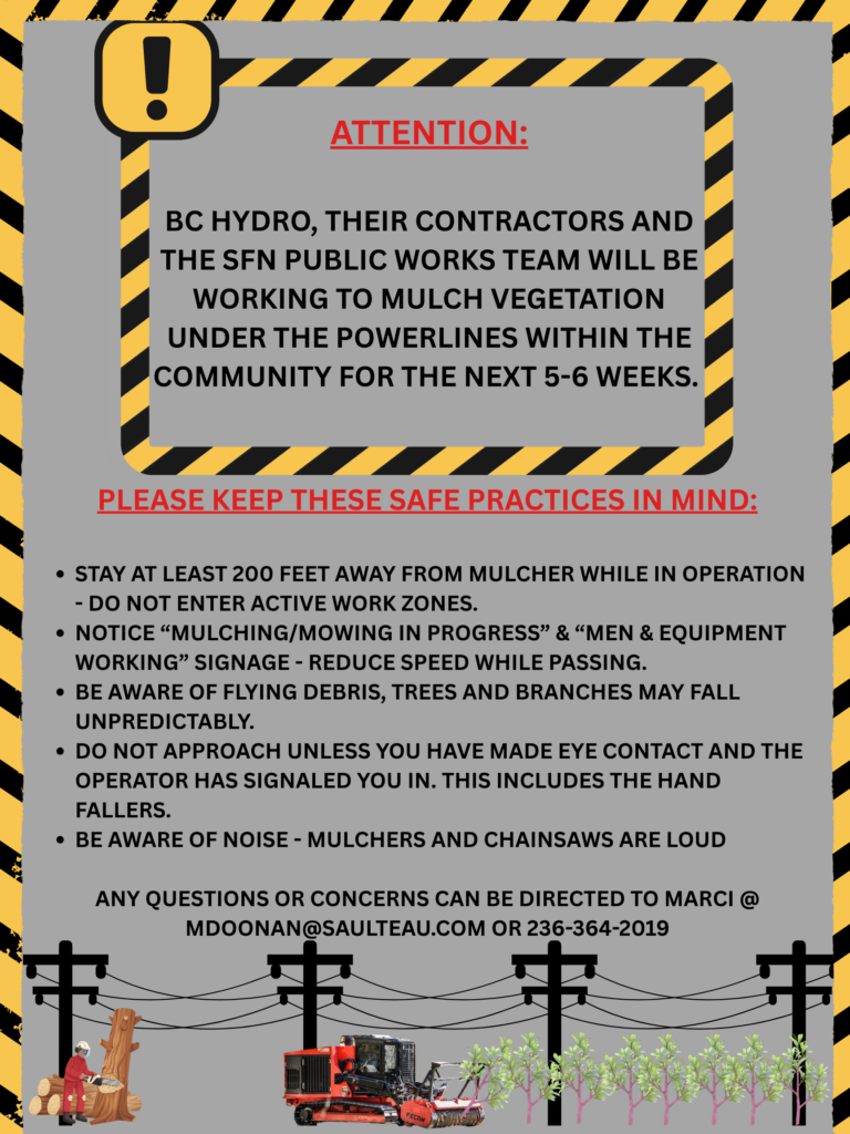 Over the next 5–6 weeks, BC Hydro, their contractors, and the Saulteau First Nations Public Works team will be working throughout the community to mulch vegetation under powerlines. This work is important for maintaining safety and reducing fire risk, but it also means active work zones and equipment will be present.