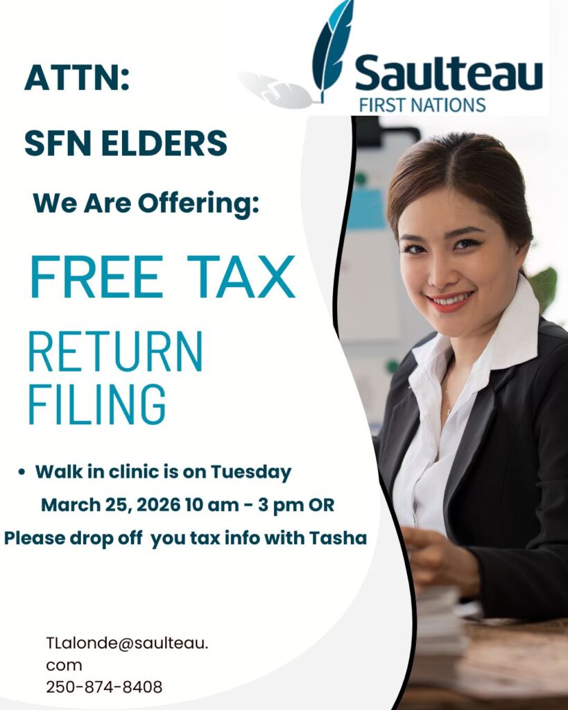 You are being offered Tax Return Filing! Please drop off your tax information to Tasha at the Cultural Centre.