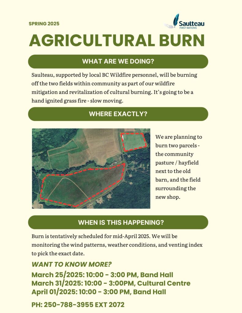 Saulteau, supported by local BC Wildfire personnel, will be burning off the two fields within community as part of our wildfire mitigation and revitalization of cultural burning. It’s going to be a hand ignited grass fire - slow moving. We are planning to burn two parcels - the community pasture / hayfield next to the old barn, and the field surrounding the new shop.