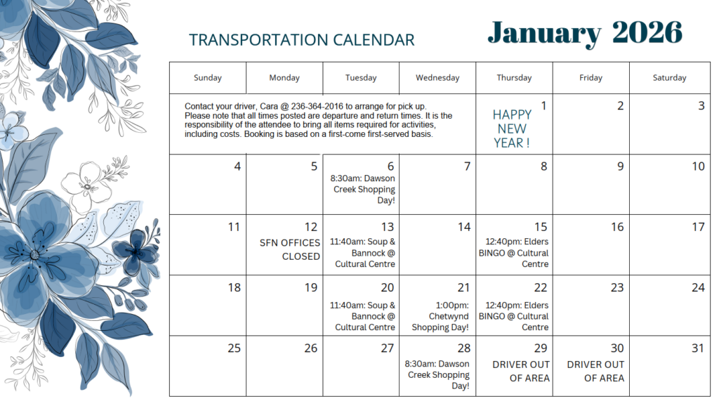 Contact our Social Transportation Driver, Cara (236-364-2016) to arrange for rides to and from our community events! January 2026 calendar included below:
