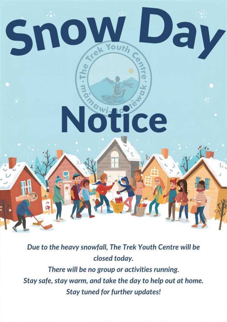 Please be advised that the Saulteau Trek Youth Centre is closed today - Dec 15 2025 - due to the excessive snow! We are hopeful that the hard working snow plows will re-establish access to the center for tomorrow (Dec 16 2025) but for today please stay home and stay safe!