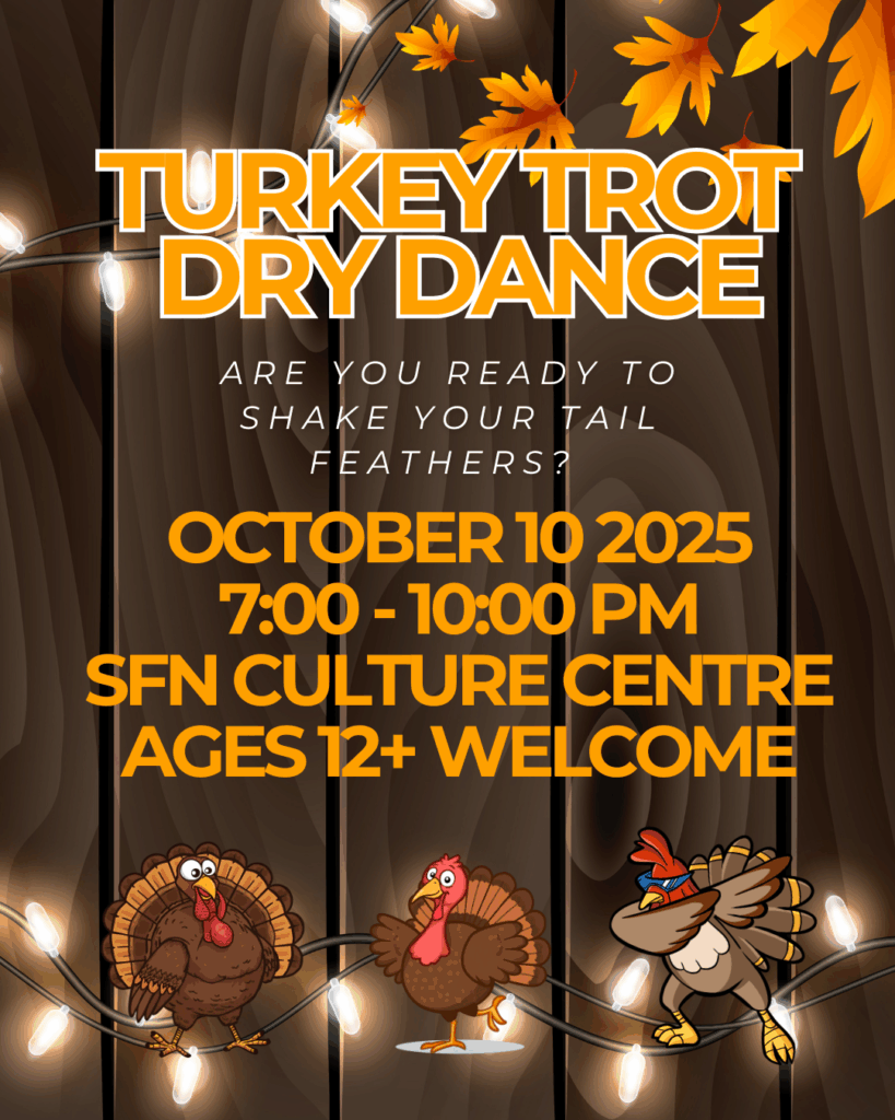 Join us for the Saulteau First Nations Turkey Trot Dance this Friday, October 10, 2025 at the SFN Culture Centre (1706 Boucher Lake Road)!