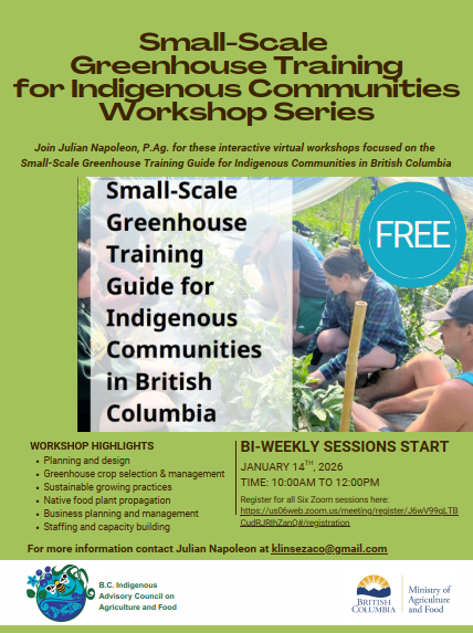 Join Julian Napoleon (of Amisk Farm) for interactive virtual workshops focused on Small-Scale greenhouse training for Indigenous Communities in BC!